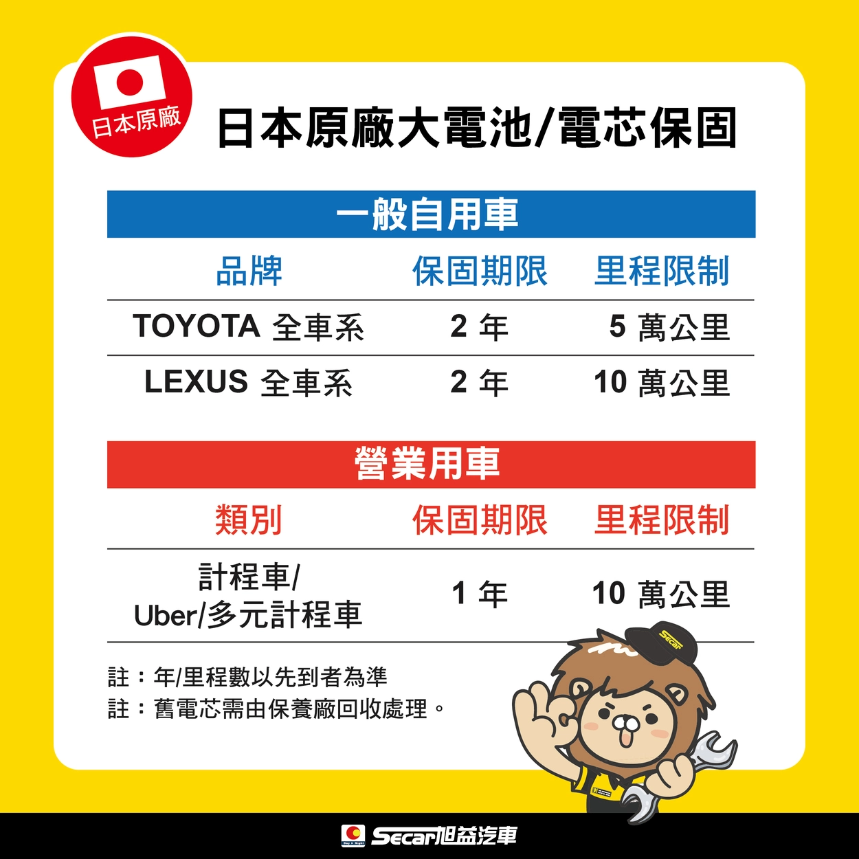 * 註:年/里程數以先到者為準。舊電芯需由保養廠回收處理。