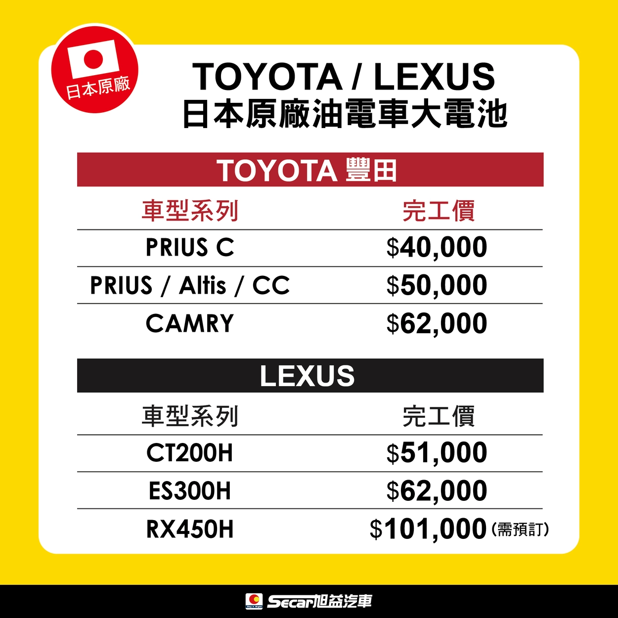 ▼ 旭益汽車:TOYOTA / LEXUS 日本原廠大電池完工價一覽表