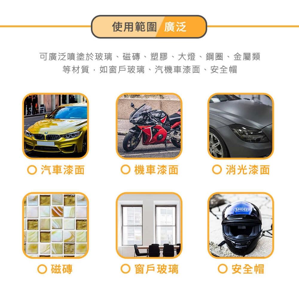 可使用,不分車色、消光漆、鍍鉻、塑料和玻璃等
